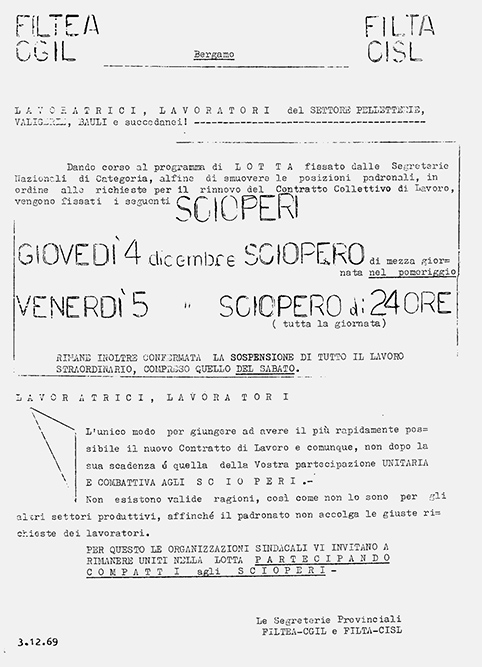 Diversamente da altri luoghi, a Bergamo il ’69 non è il culmine di una protesta iniziata l’anno precedente. La classe lavoratrice bergamasca, spesso ancora legata alla cultura contadina, fatica ad assorbire le novità delle avanguardie di fabbrica e resta stretta nella morsa dei bassi salari, del doppio lavoro, del lavoro a domicilio e del pendolarismo verso Milano. Lo scenario del lavoro è assai frastagliato: poche grandi fabbriche, molte piccole e medie aziende, un contesto in cui i sindacati interpretano con difficoltà le innovazioni del processo produttivo, uscendo sconfitti dalle ristrutturazioni degli anni precedenti.