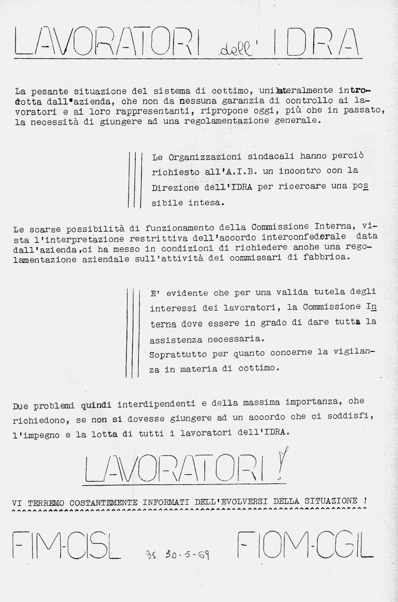 Faticosi picchetti, innumerevoli ore di sciopero e un inquietante controllo padronale destinato a sfociare in frequenti diverbi individuali sono le premesse dell’Autunno caldo dell’IDRA.